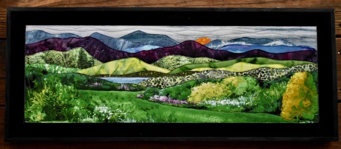 Check in with me weekly, as I’m creating new artwork all the time and will post new photos on this site, including WORKS IN PROGRESS. This is my new piece, “Mountain Springtime”. A stitched fabric collage mounted on 8″ x 24″ canvas and set inside a “float” ebony stained wood frame, 11″x 27″. $266.